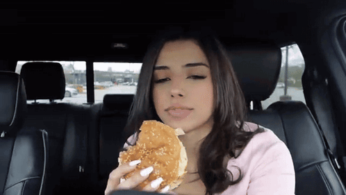 Gal Akbari enjoys a McDonald's Big Mac in her car, taking a large bite of the burger.