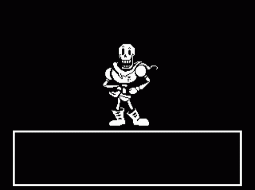Undertale's Papyrus in pixel art, holding a sword and shield within a game interface.