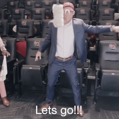 Shane Beamer hypes up the crowd with an energetic dance in an auditorium, celebrating with others.