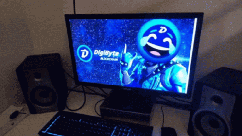 A gaming monitor displaying 'DigiByte Blockchain' with a laughing emoji.