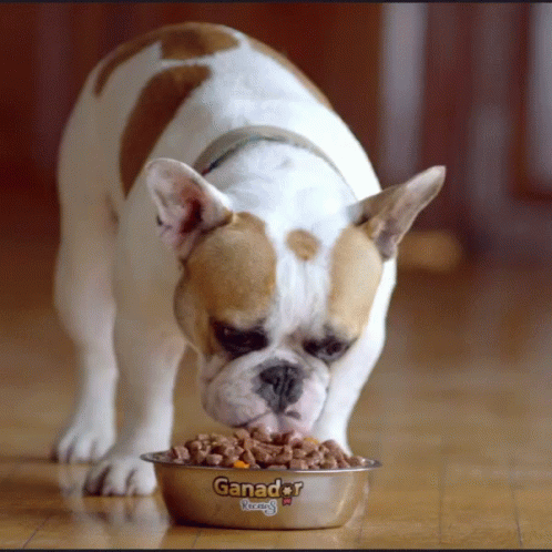 A cute French Bulldog happily eats Ganador kibble from a silver bowl on a wooden floor.
