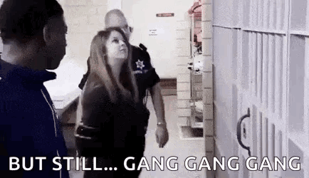 A woman in a jail cell with a police officer, making a gesture with the text 'BUT STILL... GANG GANG GANG'.
