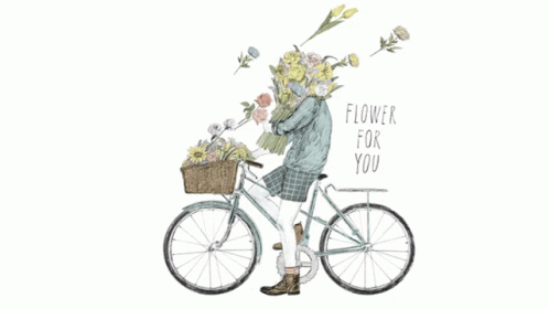 An illustration of a person with a bouquet of flowers for a head, riding a bicycle with a basket of flowers, with the text 'FLOWER FOR YOU'.