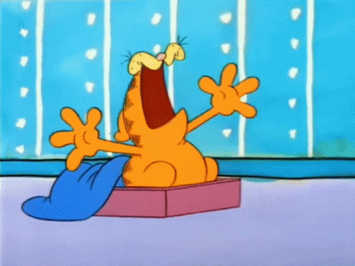 Garfield the cat yawns or screams with his mouth wide open, stretching his arms.