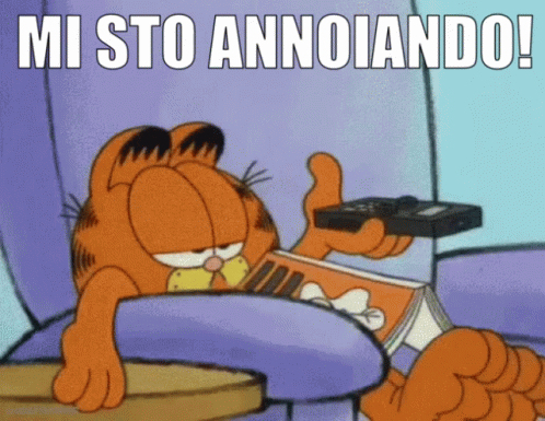 Garfield, the famous cartoon cat, lounging on a couch, holding a remote and magazine, clearly bored.