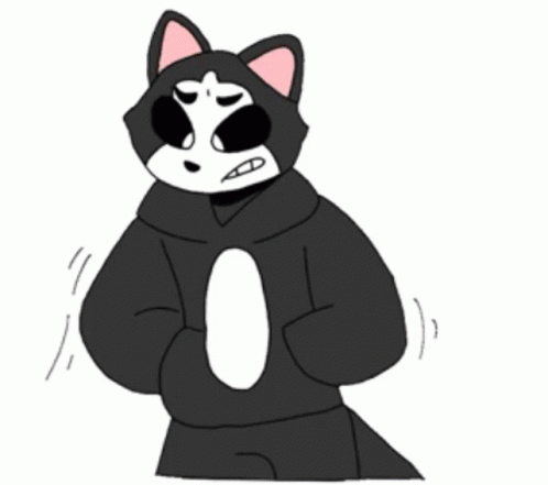 Animated black and white cat looking stressed and holding its head with both hands, showing distress.