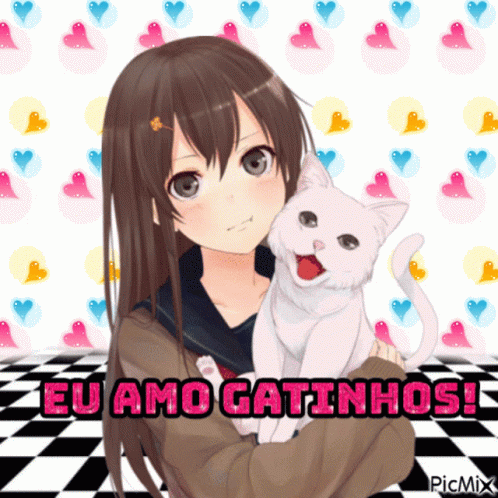 Girl holding a white cat with the phrase 'Eu Amo Gatinhos' (I Love Kittens) displayed.