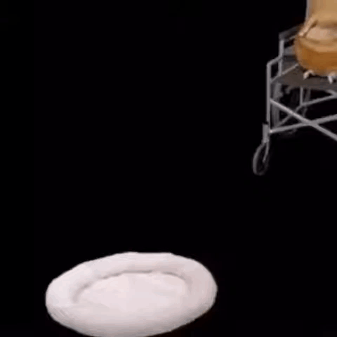 A cat in a wheelchair slowly slides and falls onto a soft pet bed.