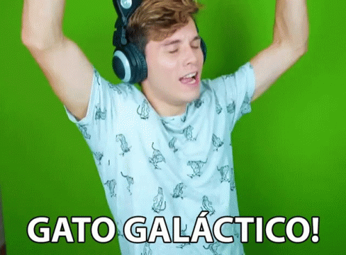 A man wearing cat-ear headphones and a Gato Galactico shirt, screaming excitedly against a green background.
