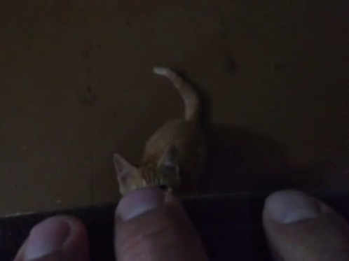 A tiny, playful kitten pounces and plays with a person's toes in a dimly lit room.