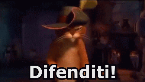 Puss in Boots, the booted cat, challenges someone to fight with the caption 'Difenditi!'.