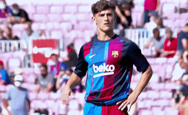 Gavi, wearing his number 30 FC Barcelona jersey, shares a warm embrace with teammate Frenkie De Jong on the soccer field.