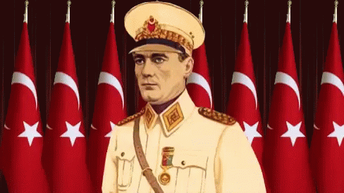 Gazi Mustafa Kemal Atatürk, in his Marshal's uniform, stands proudly before a row of waving Turkish flags.