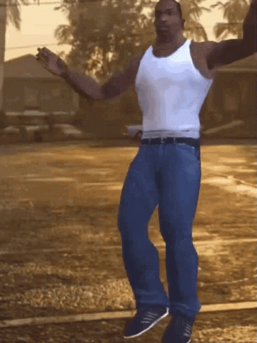 CJ from GTA San Andreas performs a dance move in a white tank top and blue jeans in an outdoor setting.