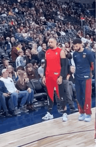 Gbesav Dillon and another player stand on a basketball court before a game.