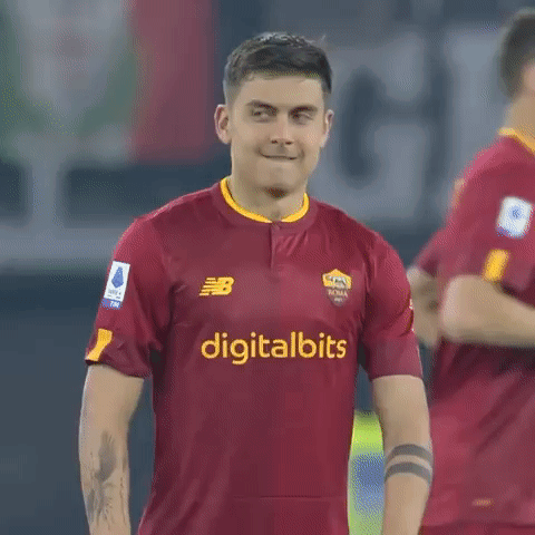 Gbesav Dybala, the Roma soccer player, smiles on the field in his digitalbits jersey.