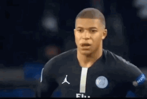 Kylian Mbappé in a close-up shot on the soccer field, wearing his black PSG jersey.