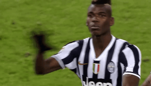 Paul Pogba performs a dab celebration on the soccer field while wearing his Juventus jersey, joined by Arturo Vidal.