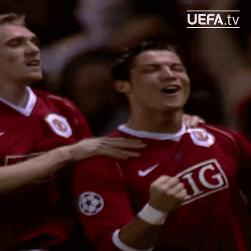 Cristiano Ronaldo celebrates a goal in his red Manchester United AIG jersey with a teammate.