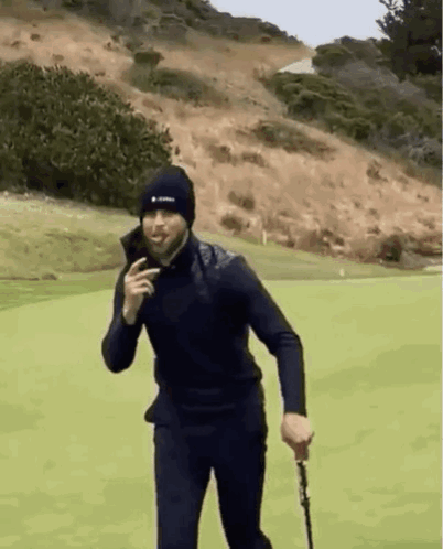 Steph Curry, wearing a black beanie and hoodie, smiles while holding a golf club and a cigar on a golf course.