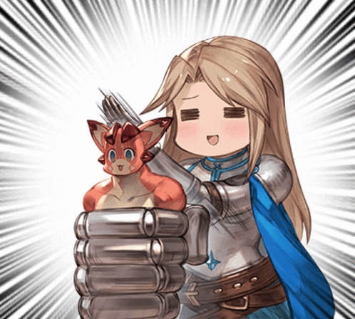 Katalina from Granblue Fantasy gently pets Vyrn while holding a stack of books.
