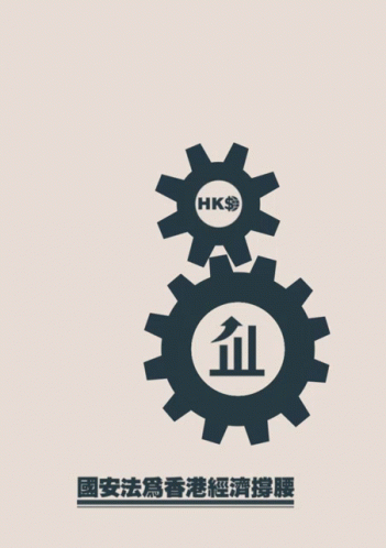 Animated gears illustrate the National Security Law supporting Hong Kong's economy, featuring HK$ and growth charts.