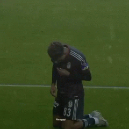 Gedson Fernandes celebrates a goal for Beşiktaş, kneeling and then standing to kiss his hand and point upwards on a rainy pitch.