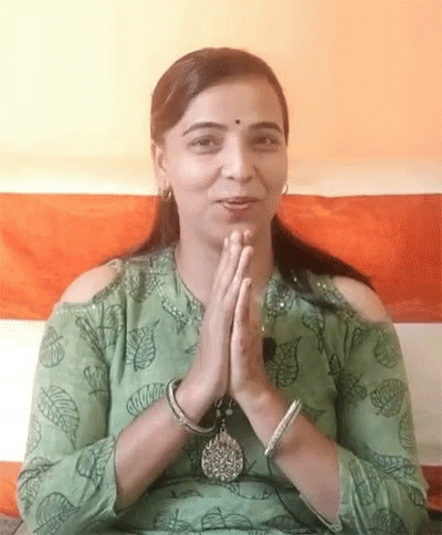 Geeta Ladies Tailoring presents a woman in a green dress making an open hand gesture, smiling warmly.