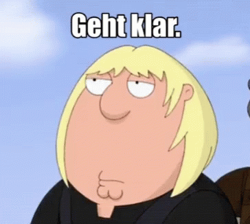 Chris Griffin from Family Guy with the German phrase 'Geht klar' (Alright) above his head.