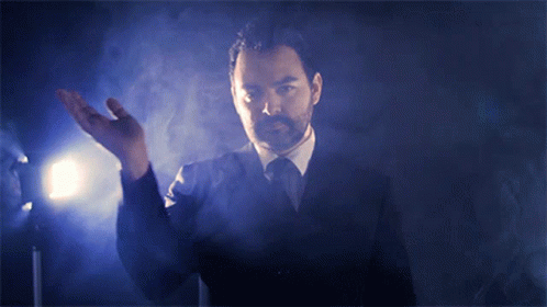 William Bonner-like figure in a suit with a dramatic dry ice smoke effect, a parody of a news anchor.