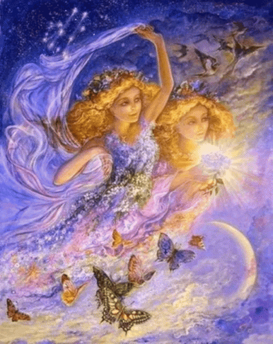 A vibrant painting depicting two ethereal women representing the Gemini constellation, surrounded by butterflies and celestial elements.