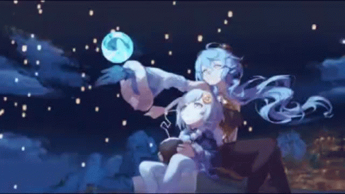 Ganyu and Qiqi from Genshin Impact under a beautiful night sky with glowing lanterns.