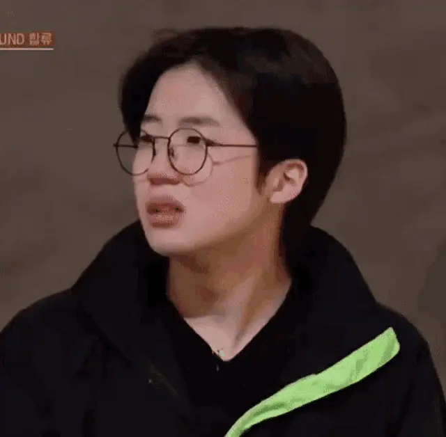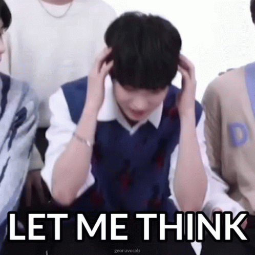Geonu from JUSTB holds his head, looking thoughtful, with the caption 'LET ME THINK'.
