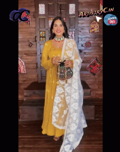 Woman models a stunning yellow Georgette Anarkali suit, perfect for daily wear, available for international shipping.