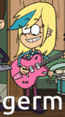 Sam Sharp, also known as Germ, from The Loud House, smiles while holding her pink electric guitar.