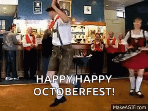 Man in traditional German attire performs a lively Schuhplattler dance at an Octoberfest celebration.
