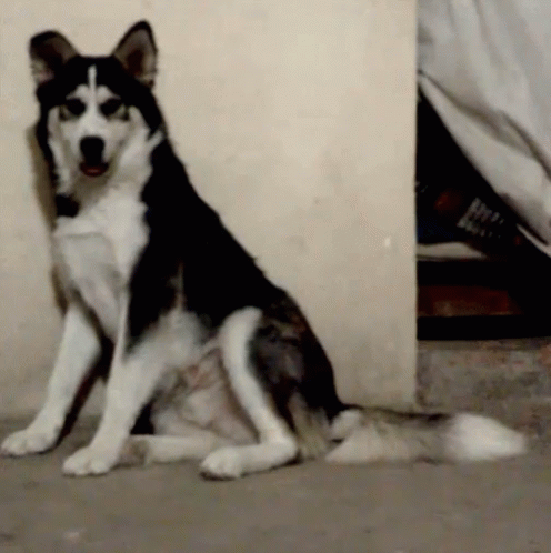 A beautiful black and white German Shepherd dog sits calmly, looking around with a happy expression.