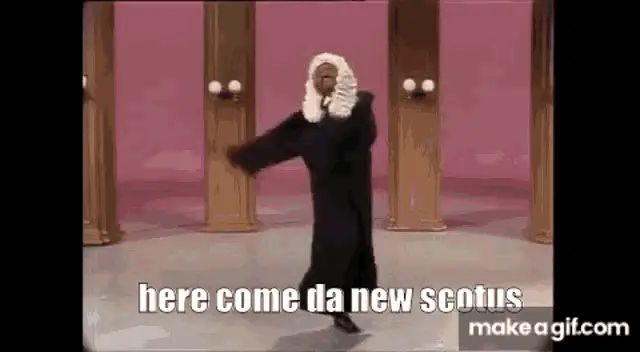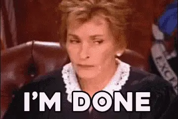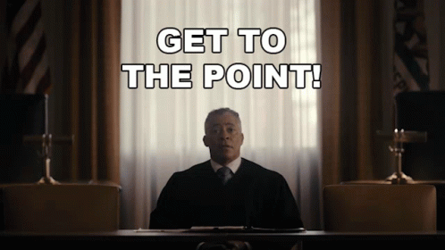 A judge, possibly Dominic Hoffman from Goliath, sits at a desk with 'GET TO THE POINT!' text.