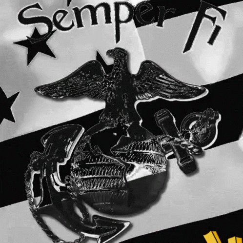 A striking black and white image featuring the US Marine Corps emblem and the motto 'Semper Fi'.