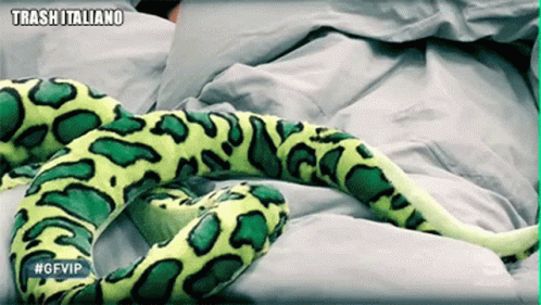Fernanda Lessa rests in bed with a large green and yellow snake plushie during Grande Fratello VIP.