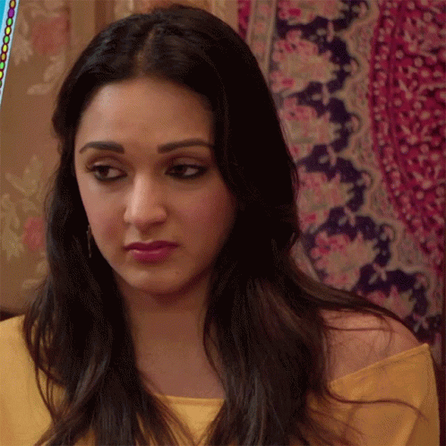 Kiara Advani as Indira Gupta, looking nervous and uncomfortable in a close-up shot from a Bollywood movie.