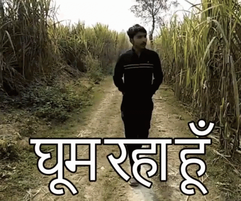 A man walks on a dirt path through lush green fields, with the Hindi text 'घूम रहा हूँ' (I am walking) overlaid on the video.