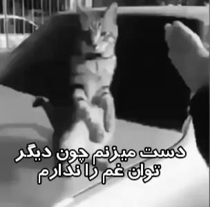 A cat stands on its hind legs with Persian text: 'I clap my hands because I no longer have the strength for sorrow.'