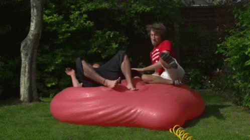 Two men on a giant red water balloon get drenched as it spectacularly pops in a garden.