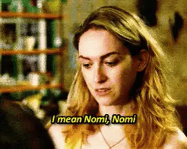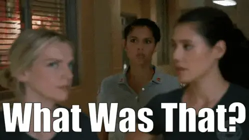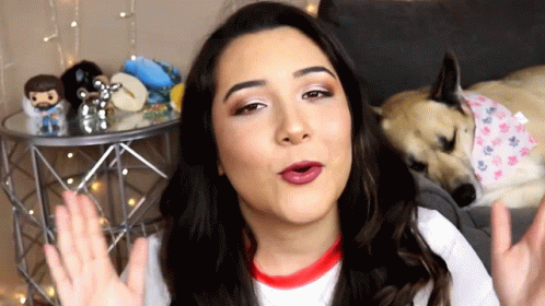 Rae makes a funny face, appearing tongue-tied or speaking gibberish, with her dog relaxing nearby.