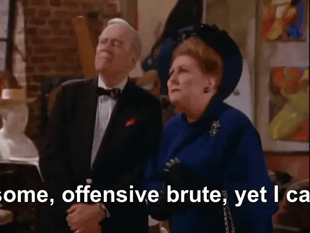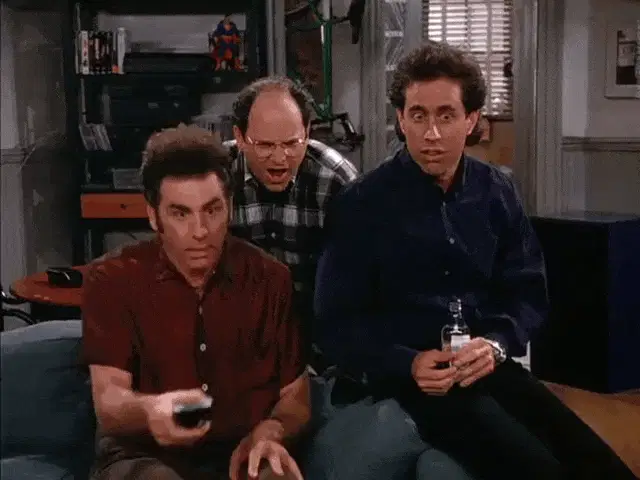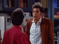Kramer from Seinfeld delivers his iconic 'Giddy Up!' catchphrase in a classic kitchen scene.