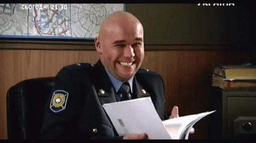 A bald man in a police uniform laughs heartily, covering his mouth in an office setting.