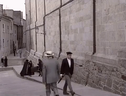 People walking through the streets of Santiago de Compostela, Galicia, in a black and white historical scene.