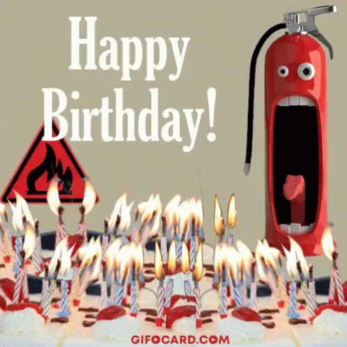 A humorous birthday card featuring a fire extinguisher with a cartoon face, perfect for a unique greeting.
