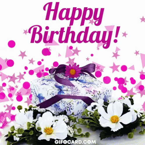 An animated Gifocard showing a gift box opening to reveal flowers and "Happy Birthday" text.